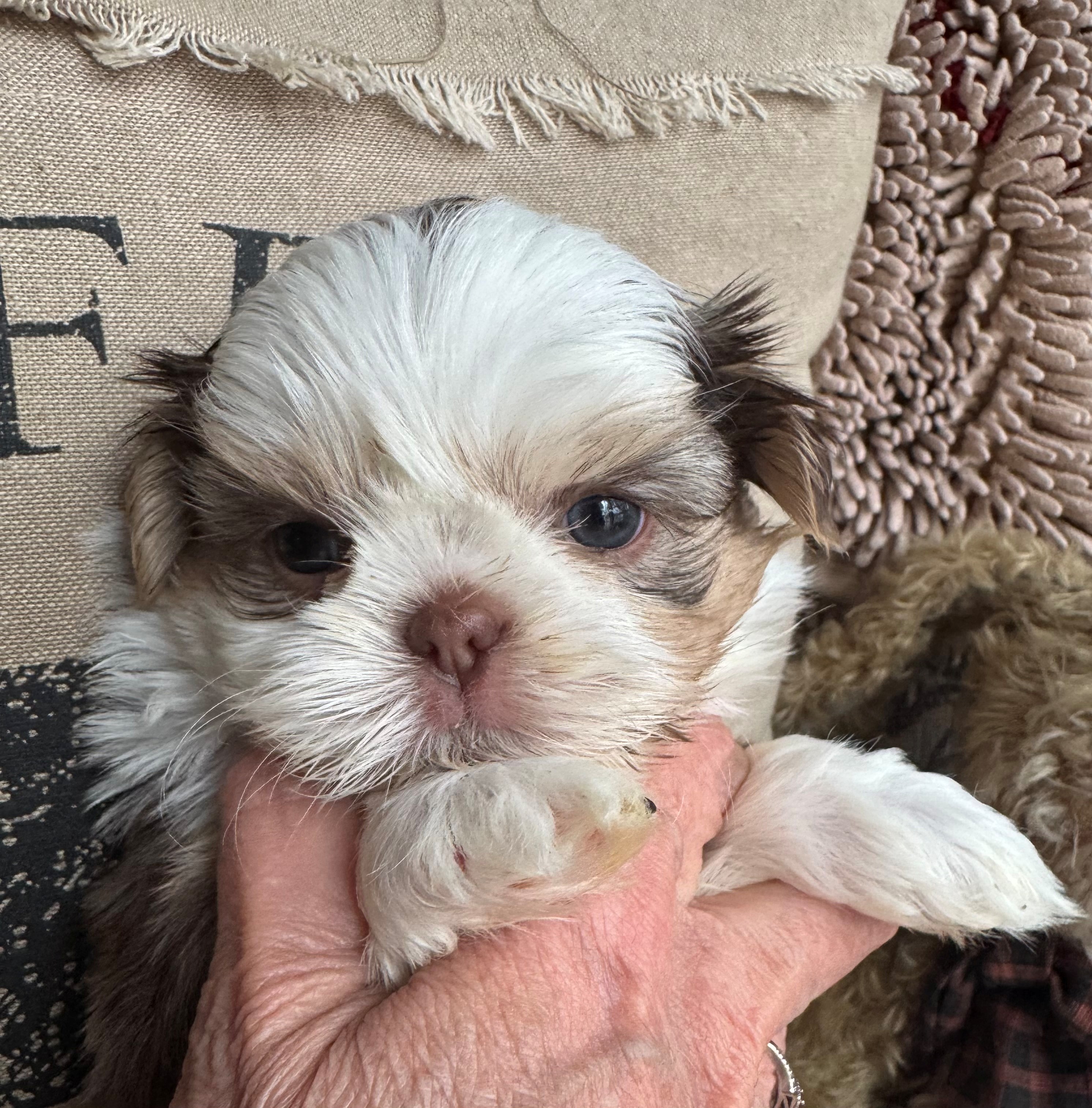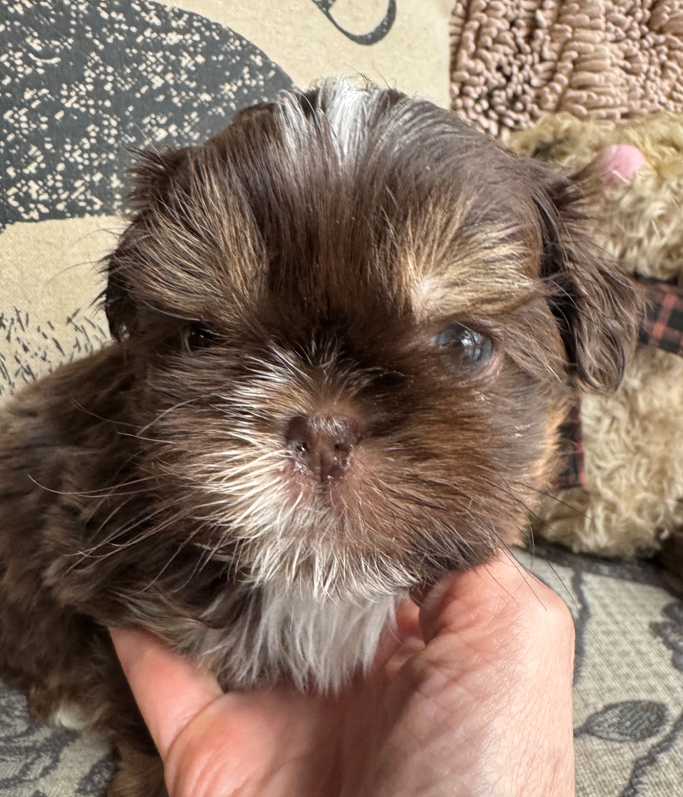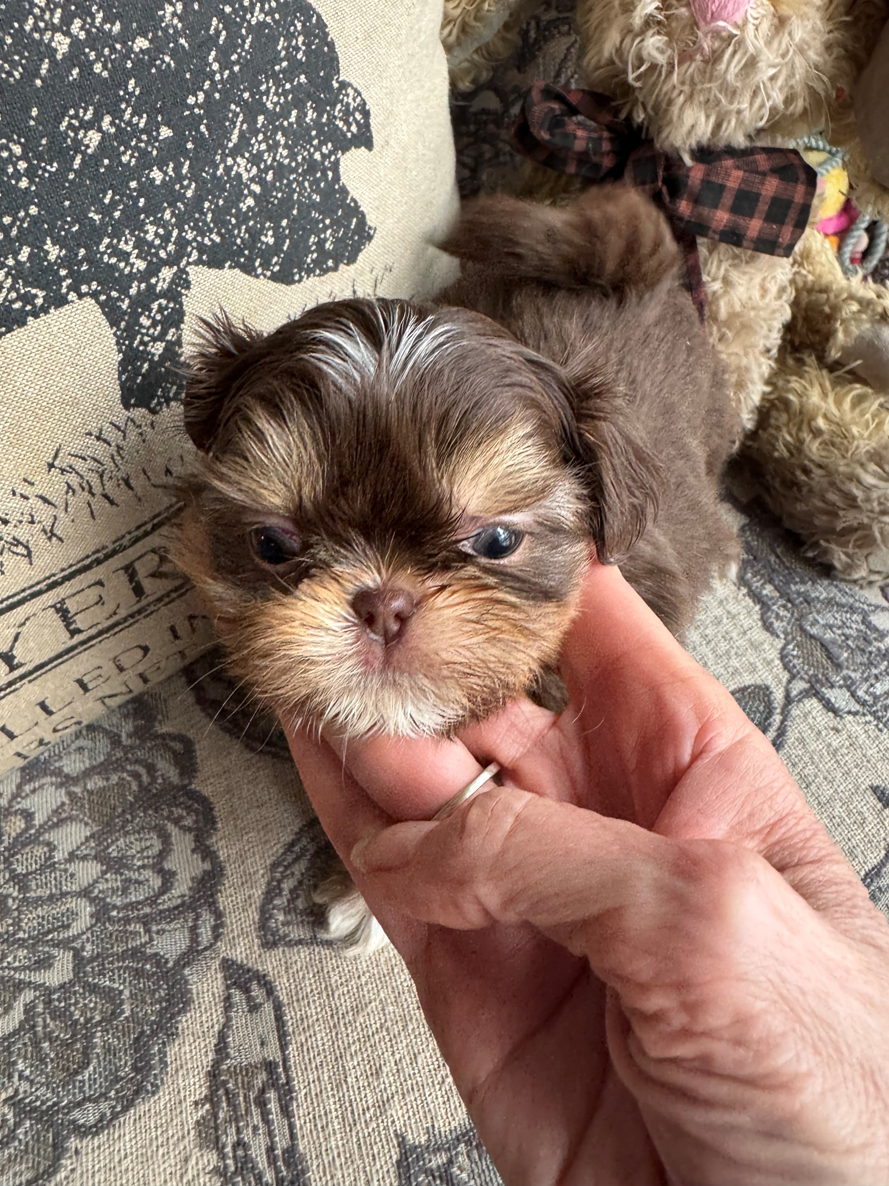 Elsie is our first keeper from Whitney and Basil. She is a liver dobie marked Shih Tzu . She is 10 lbs and she has personality plus. Elsie is in our guardian placement program and comes back home to be bred and then again to give birth and take care of her babies. Elsie carries parti, dobie marked, and solid puppies. Elsie is DNA tested with clear genetics. She is Masterpiece's 2nd generation vax -free. Her puppies are 3rd generation vax-free. $2000