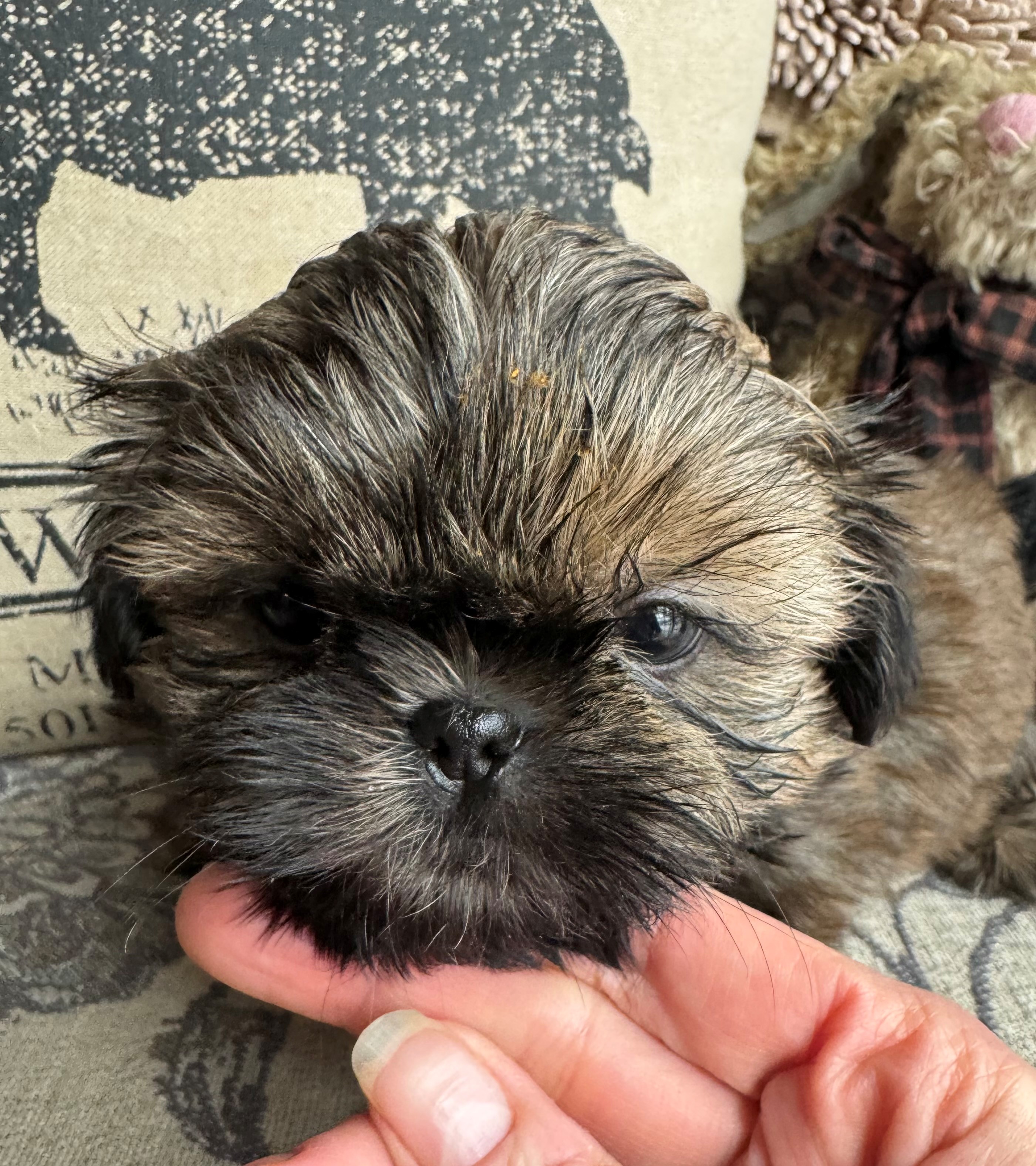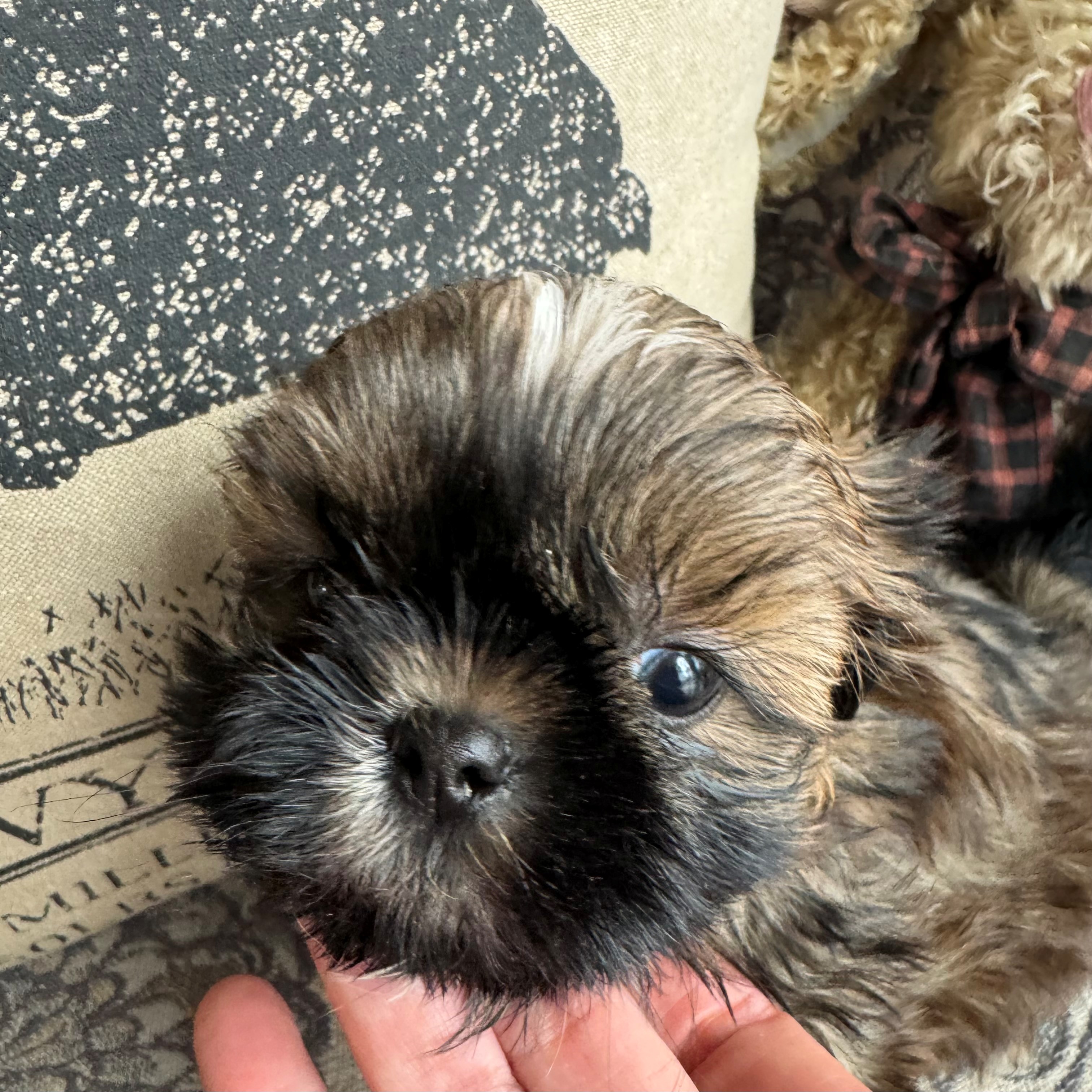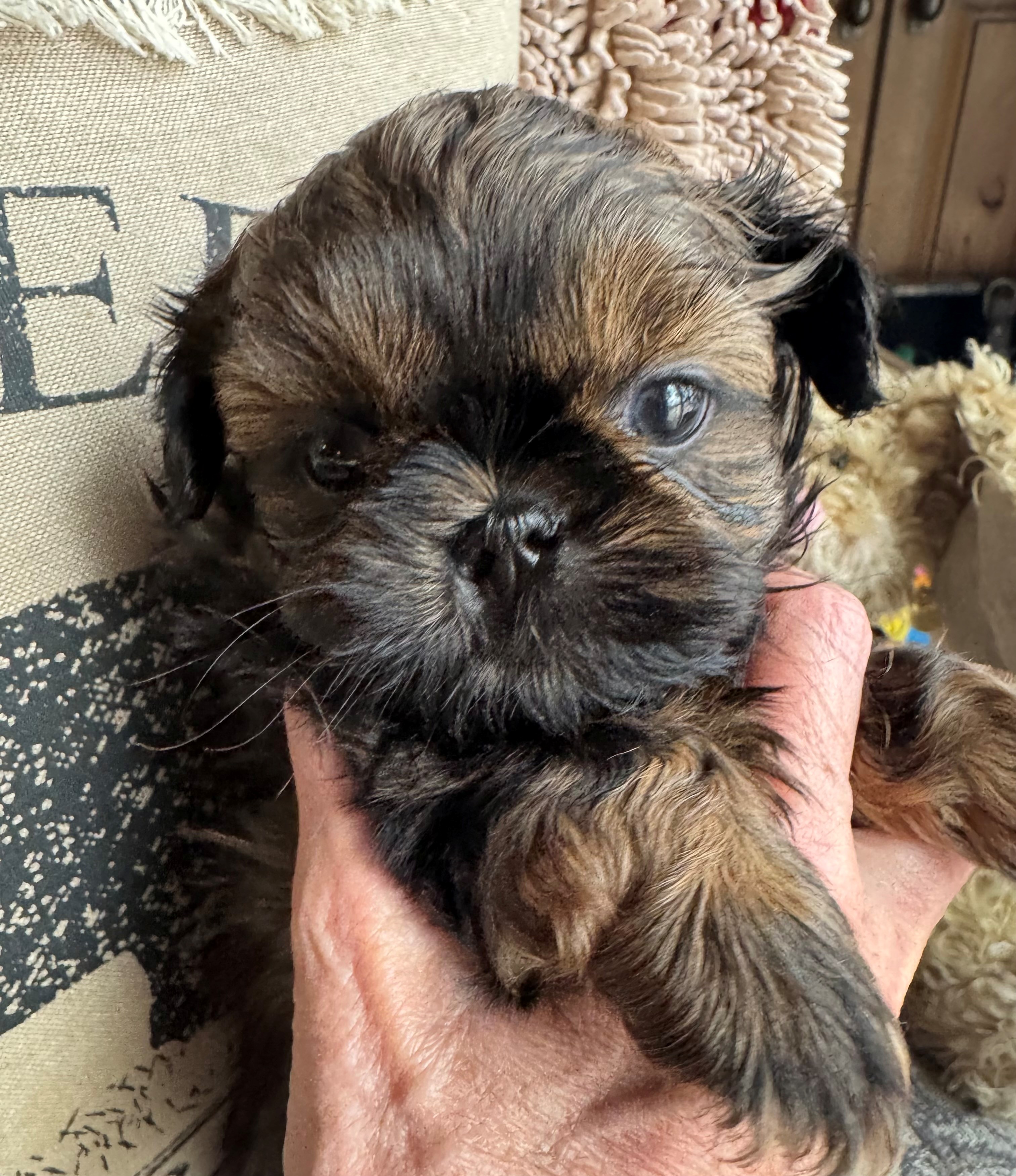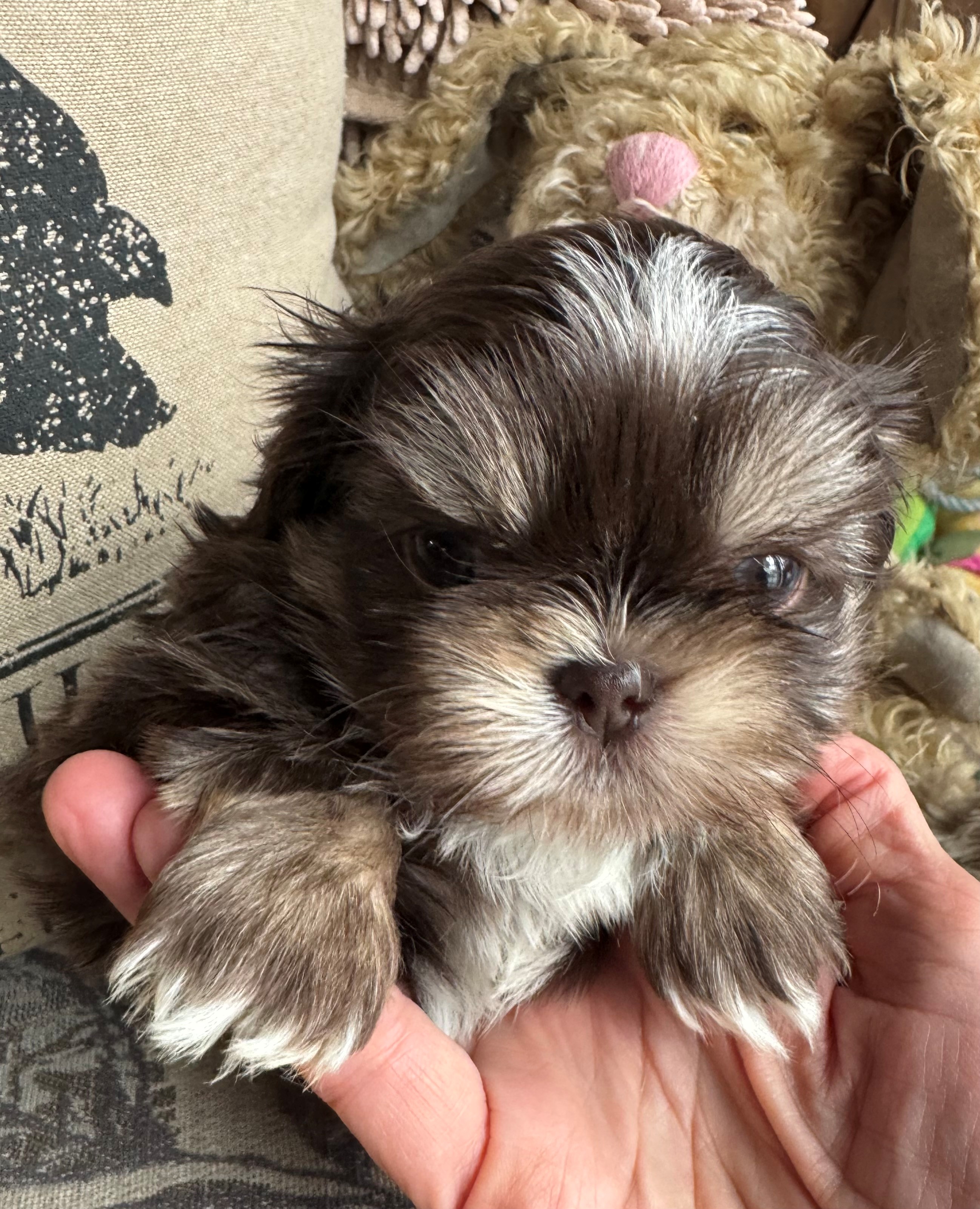 Elsie is our first keeper from Whitney and Basil. She is a liver dobie marked Shih Tzu . She is 10 lbs and she has personality plus. Elsie is in our guardian placement program and comes back home to be bred and then again to give birth and take care of her babies. Elsie carries parti, dobie marked, and solid puppies. Elsie is DNA tested with clear genetics. She is Masterpiece's 2nd generation vax -free. Her puppies are 3rd generation vax-free. $2000