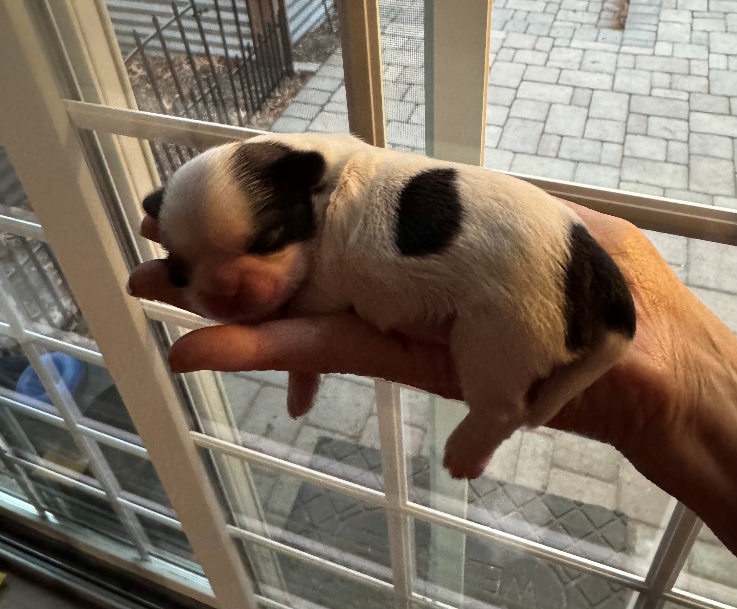 Harper is our tiniest mommy. She is 7 lbs and she might be small but she is definitely the sassy pants of the gang! Harper throws solid and parti puppies. Black/white, blue, blue/white, and red/white. **Prices are pet price only - $1800